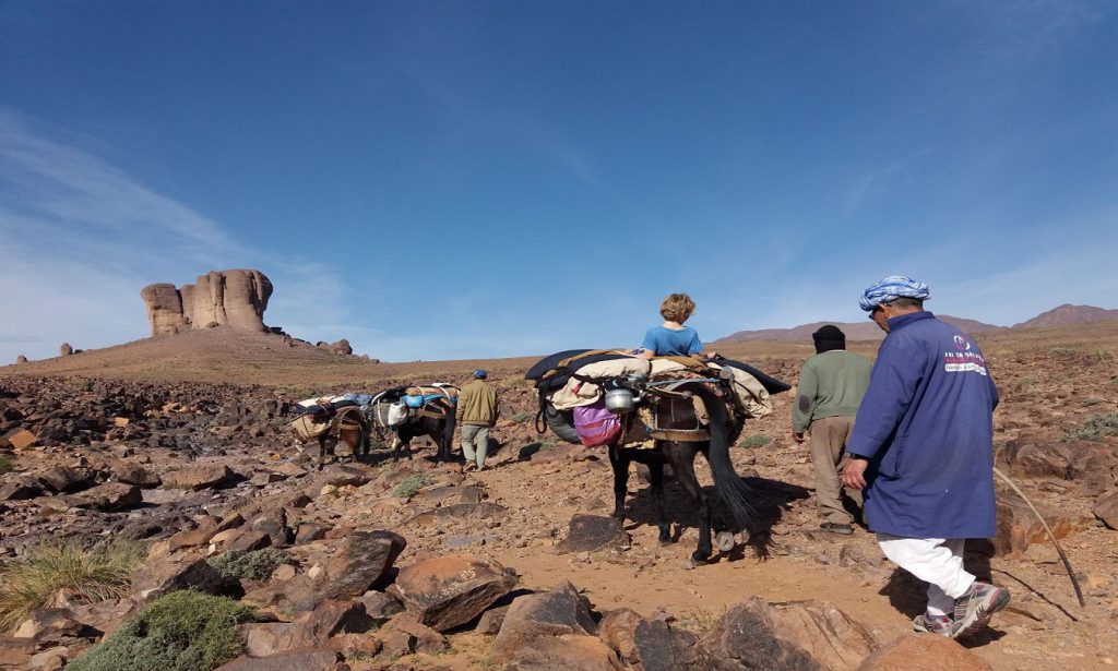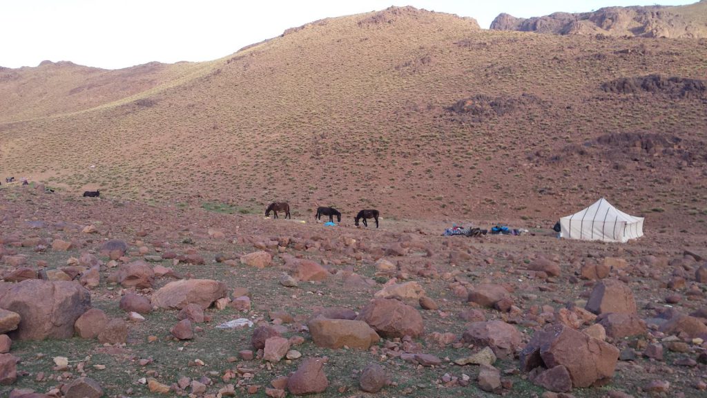 We walk via the Karkawch pass (2500 m) to Almou N’Ouarg, a 5-hour walk with a picnic lunch. Dinner and camping are at a location with a beautiful view.